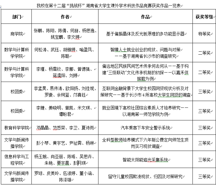 我校在第十二届“挑战杯”湖南省大学生课外学术科技作品竞赛中喜获佳绩