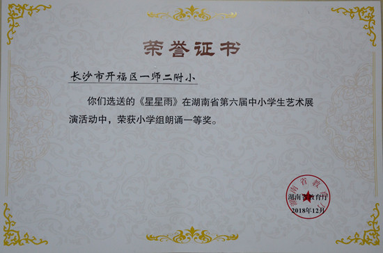 近日,湖南省教育厅下发《关于湖南省第六届中小学生艺术展演活动获奖情况的通报》。我校二附小选送的节目《星星雨》在本届展演活动中荣获小学组朗诵一等奖第一名,并将作为湖南省唯一一个朗诵节目推送至教育部参加第六届全国中小学艺术展演。