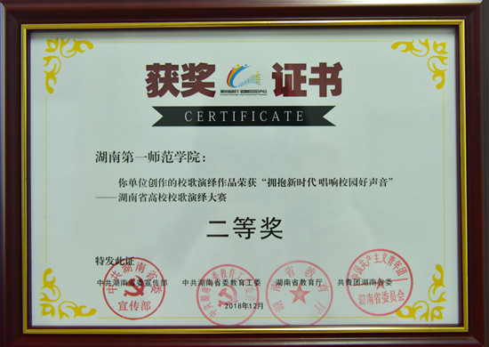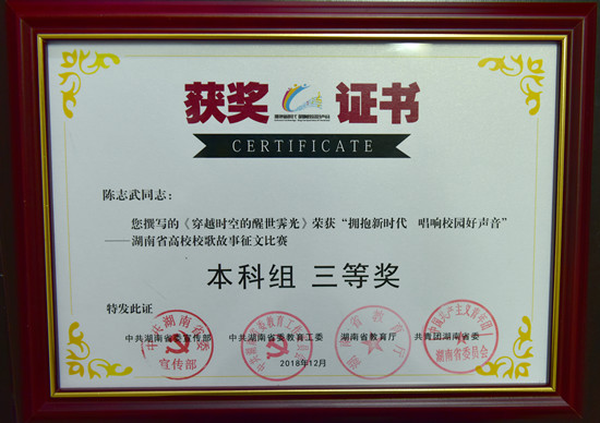 12月28日下午,湖南省第五届校园文化论坛暨全省高校校歌系列主题活动颁奖典礼在长沙举行。我校获得校歌演绎二等奖;我校陈志武的《穿越时空的醒世霁光》获得校歌故事征文三等奖。