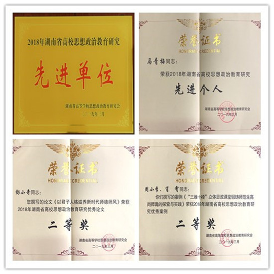 3月28日,湖南省高等学校思想政治教育研究会2018年年会在张家界航空工业职业技术学院召开。湖南省教育厅党组成员、省委教育工委委员徐伟,湖南省高校思想政治教育研究会会长、中南大学党委副书记陈治亚等领导出席会议。会议表彰了2018年湖南省高校思想政治教育研究先进单位、先进个人以及湖南省高等学校思想政治教育优秀论文、案例、专著。我校获得多项荣誉:我校被授予“2018年湖南省高校思想政治教育研究先进单位”荣誉称号;数学与计算科学学院马青梅荣获“2018年湖南省高校思想政治教育研究先进个人”荣誉称号;校党委书记彭小奇撰写的论文《以君子人格滋养新时代师德师风》获评全省高校思想政治教育研究优秀论文二等奖;马克思主义学院周小李、肖霄申报的案例《“三维十径”立体思政课堂锻铸师范生高尚师魂的探索与实践》获评全省高校思想政治教育研究优秀案例二等奖。