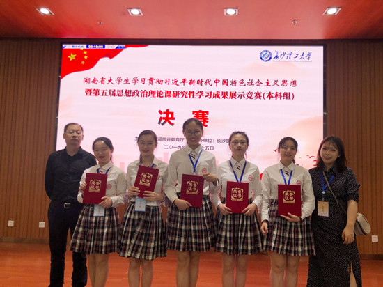 5月25日,由湖南省教育厅举办的“湖南省大学生学习贯彻习近平新时代中国特色社会主义思想暨第五届大学生思想政治理论课研究性学习成果展示竞赛决赛(本科组)”在长沙理工大学举行。经过校内初赛、复赛重重遴选,来自我校文传院739班的刘雨晨、张薇、张占鑫、钟志芳、陈昱伶五位同学代表我校参加并获得了二等奖(指导老师:肖彦、肖霄)。