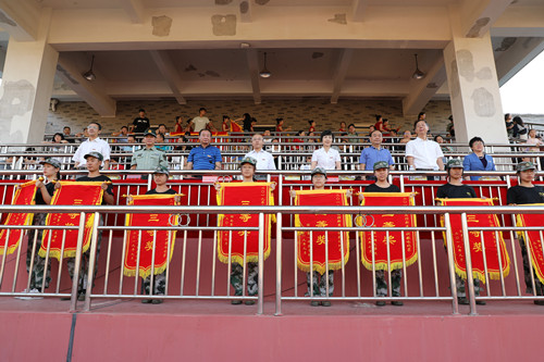 校领导刘志敏、刘鸿翔、刘宇、李昱、江正云,城南书院院长张尚晏分别宣读了两个校区的新生军训标兵、内务评比优秀寝室、军歌演唱优秀方阵和分列式优秀方阵名单,全体领导向受到表彰的集体和个人颁发了锦旗和获奖证书。彭小奇代表学校向承训单位张家界航空工业职业技术学院赠送了锦旗。