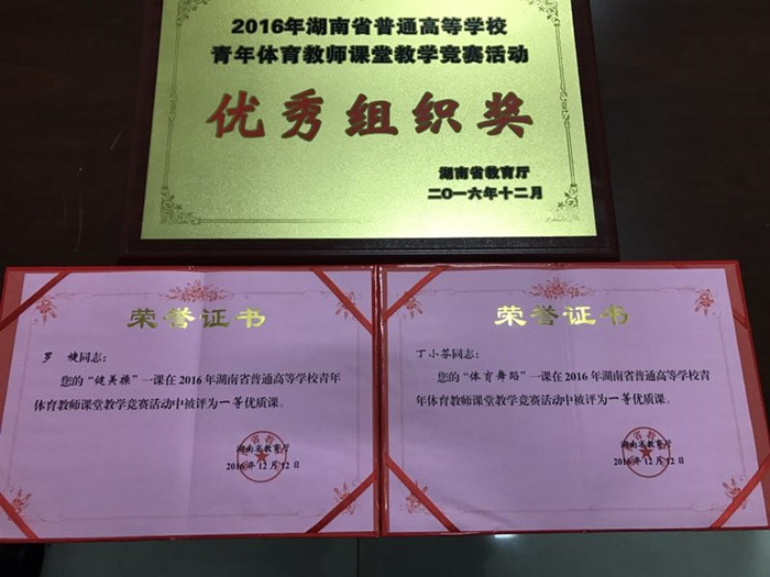 近日,由省教育厅主办的2016年湖南省普通高校青年体育教师课堂教学竞赛活动揭晓。我校体育学院丁小芬、罗婕、钟小燕、史敏4名参赛教师全部获奖,其中丁小芬老师的体育舞蹈课程获本科公共课组一等奖,罗婕老师的健美操课程获本科专业术科组一等奖,钟小燕老师的学校体育学课程获本科专业理论组三等奖,史敏老师的趣味田径——十字跳课程获本科公共课组三等奖;我校荣获优秀组织奖。