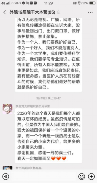 面对新冠肺炎疫情,外国语学院与体育学院党总支坚持疫情防控不松懈、党员教育不断档,积极探索学生党员的培养教育模式,引导学生党员在疫情防控战役中践行初心使命,确保了疫情防控期间学生党员教育管理工作持续有效推进。