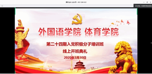 高高飘扬在疫情斗争第一线的党旗深深吸引了青年学子,向高高飘扬的党旗迅速靠拢……,300余名学生向党组织递交了一封封火热的入党申请书,经推优、考察等规定程序,两所学院最终共确定了138名入党积极分子。为进一步增强他们的党性认识,深化党的基本理论、基本路线和基本纲领的教育,两院从学习强国等网络平台精心挑选《学党章系列课程》《<共产党宣言>和共产党员的信仰与使命》《十九届四中全会精神解读》《战“疫”如何彰显中国制度优势和治理优势》等优质线上课程对入党积极分子开展培训。3月30日晚19时,开班典礼由外国语学院党总支书记李亚林主持,体育学院党总支书记谢培松以《不做精致的利己主义者》为主题进行开班动员,号召同学们志存高远、学做合一、提升素养,树立共产主义理想,把自己的人生追求同祖国和民族的前途命运联系起来。