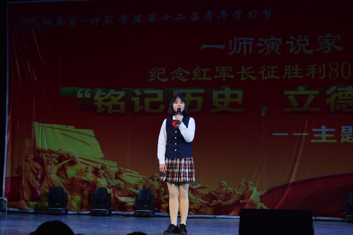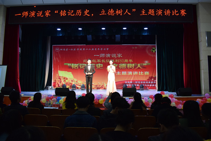 为纪念长征胜利80周年,倡导一师学子铭记党的历史,弘扬长征精神,11月4日晚7点,以“铭记历史,立德树人”为主题的首届“一师演说家”演讲决赛在科技楼演播厅举行。文小妮老师、范利老师、肖彦老师担任此次比赛的导师兼评委,党委宣传部部长何文、马克思主义学院院长周小李、一师附小王华老师担任本次比赛的评委。教务处处长李茂平、校团委副书记邓海平及各院的团总支书记出席本场比赛。