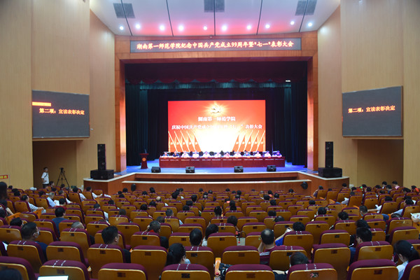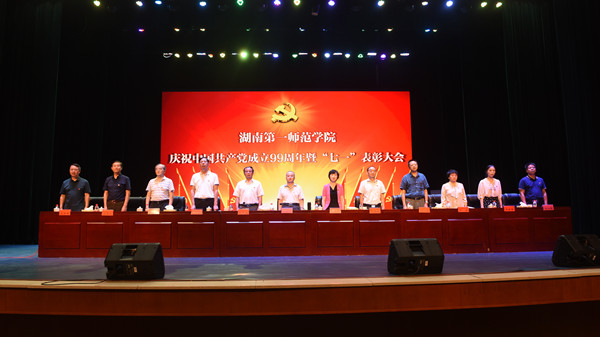 6月30日下午,学校在田汉剧场隆重召开庆祝中国共产党成立99周年暨“七一”表彰大会。校党政领导,校纪委委员,各部门(单位)党政负责人,各党总支副书记、总支委员,各党支部书记,受表彰集体及个人参加大会。会议由校党委副书记刘志敏主持。