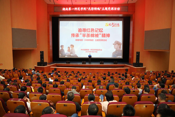 为巩固深化“不忘初心、牢记使命”主题教育成果,深入学习党史和新中国史,发扬新时代长征精神,9月29日下午,学校全体在家党政领导、全体师生党员在东方红校区田汉剧场共同观看电影《半条棉被》。主题党课观影仪式由校党委书记彭小奇主持。