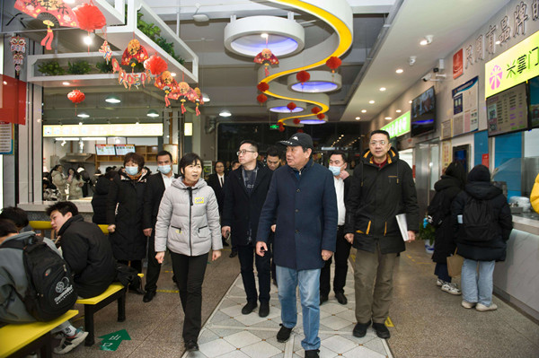 2020年12月31日,省教育后勤协会一行来校开展“喜迎新年,争创中国好食堂”现场考察活动。协会会长杨定忠、副会长兼秘书长夏智勇、伙食管理专委会主任张泽麟及在长13所高校后勤负责人参加了活动。校党委书记彭小奇、校长童小娇、副校长刘宇陪同考察。