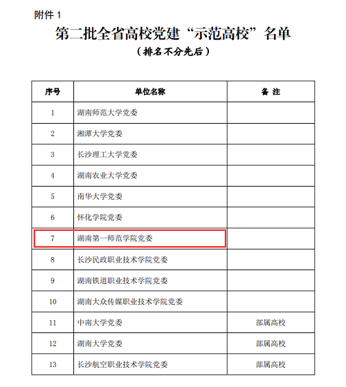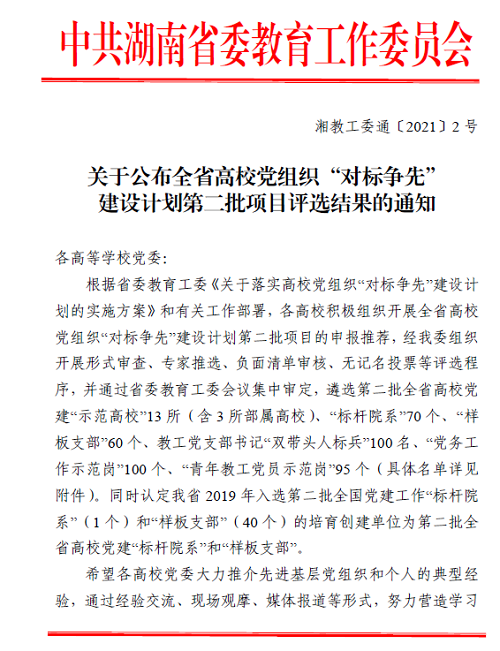近日,中共湖南省委教育工作委员会印发了《关于公布全省高校党组织“对标争先”建设计划第二批项目评选结果的通知》(湘教工委通〔2021〕2 号),我校党委被评为全省高校党建“示范高校”、马克思主义学院党总支被评为全省高校党建“标杆院系”、文学与新闻传播学院教工第三党支部被评为全省高校党建“样板支部”、数学与计算科学学院信科与高数教研室党支部书记杨旭光、商学院国际经济与贸易教研室党支部书记郑准被评为全省高校教工党支部书记“双带头人标兵”、外国语学院学生第一党支部书记、学工办主任陈阳被评为全省高校“党务工作示范岗”、教育科学学院党总支教师党员江华军被评为全省高校“青年教工党员示范岗”。