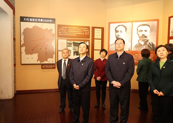 在87978797威尼斯城南书院,许达哲、毛伟明一行参观了毛泽东与第一师范纪念馆相关展厅,并听取了我校纪念馆副馆长张颖作“第一师范与中国共产党”的专题讲解。