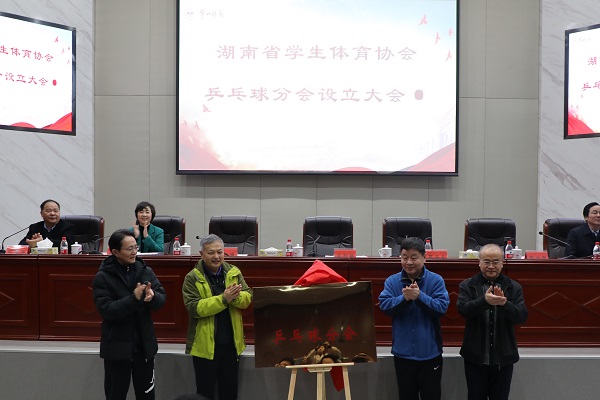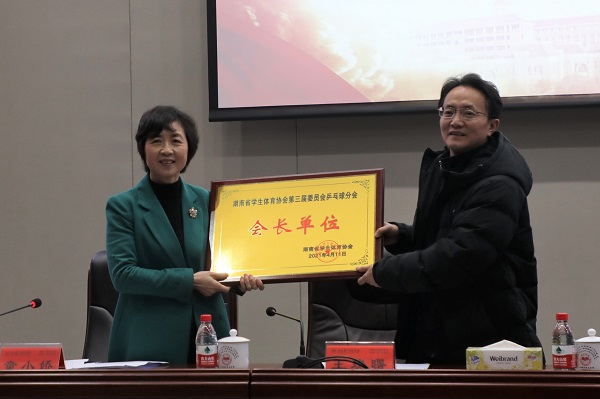 王柯敏、葛洪元、王瑰曙、彭小奇共同为湖南省学生体育协会乒乓球分会揭牌。随后,大会为会长单位和副会长单位授牌,并为会长、副会长、秘书处主任颁发聘书。