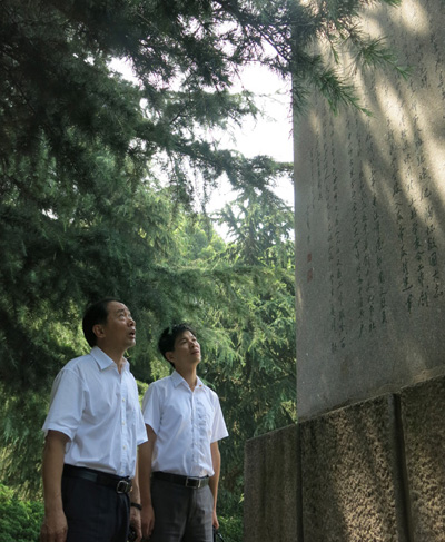李铁映同志的父亲李维汉是我校杰出校友,也是我党早期领导人,曾任全国人大常委会副委员长、全国政协副主席。李铁映同志对我校怀有深厚的感情,在其担任中共中央政治局委员、全国人大常委会副委员长期间,曾先后三次来我校视察。此次,赵立军受李铁映之托专程前来调研,并在纪念馆贵宾室认真翻阅了李铁映同志1993年10月1日为纪念毛泽东同志求学一师80周年撰写的《毛泽东在第一师范》一文和李铁映同志2003年12月16日为我校百年校庆所作题词“壮志鸿鹄 大计经纬”两份原件。在青年毛泽东铜像广场,赵立军实地察看了刻在铜像背面的李铁映同志文章《毛泽东在第一师范》和李铁映同志2006年3月25日在铜像广场东侧亲植的、已经枝繁叶茂的雪松。