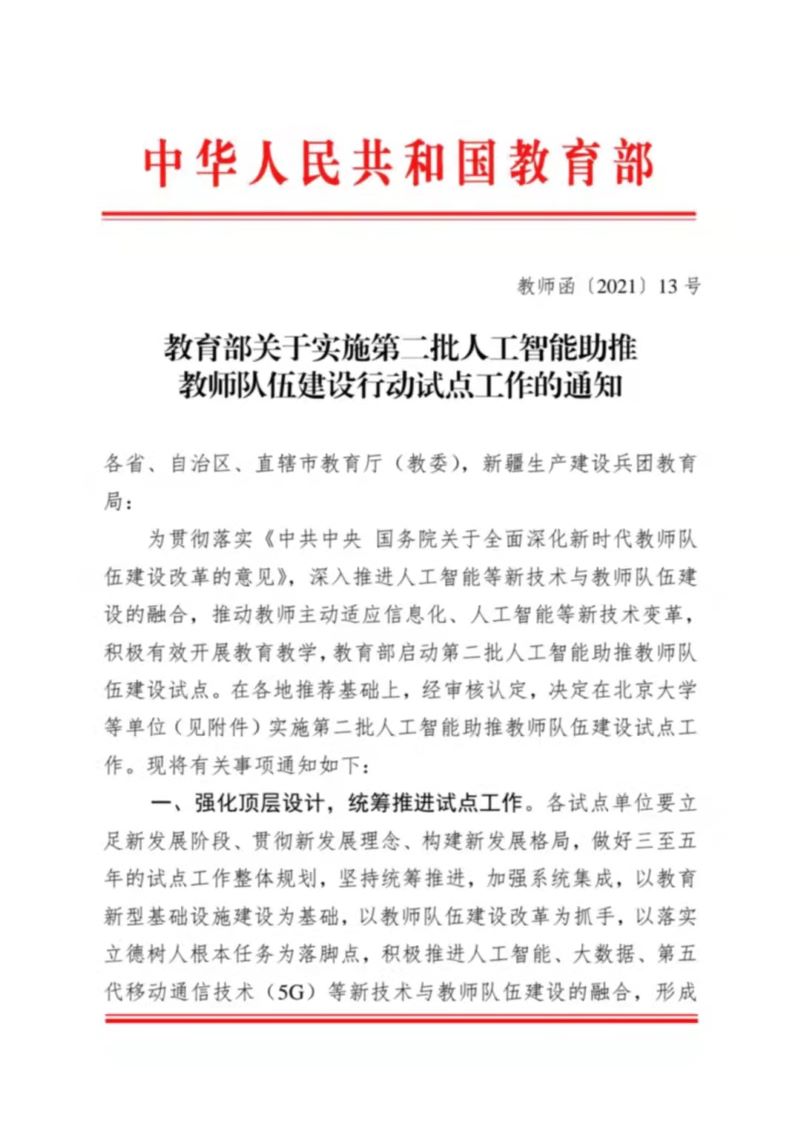 近日,教育部公布了第二批人工智能助推教师队伍建设试点单位名单,经单位申报、逐级推荐和专家评审,我校成功获批“教育部第二批人工智能助推教师队伍建设试点单位”。