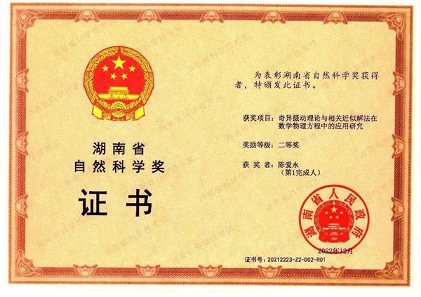 近日,2021年度湖南省科技创新奖励大会在长沙召开。省委副书记、省长毛伟明出席大会并为2021年度湖南省科学技术奖获奖代表颁奖。我校作为第一完成单位获奖2项,其中,我校陈爱永教授的成果《奇异摄动理论与相关近似解法在数学物理方程中的应用研究》获得省自然科学二等奖,杨恒伏教授的成果《图像内容安全理论与新方法研究》获得省自然科学三等奖。