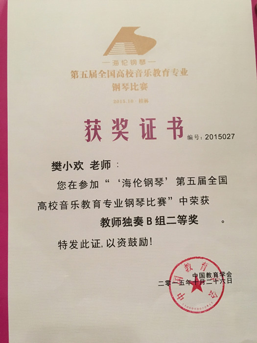 本届比赛分为教师独奏、教师双钢琴演奏、研究生独奏、研究生伴奏四个组别。我校音乐舞蹈学院选派了四名教师参加比赛,并全部获奖。在教师独奏B组的比赛中,樊小欢老师获二等奖,毕琼文老师获三等奖,谭娜老师获优秀奖;在双钢琴演奏的比赛中,吴易颖老师与毕琼文老师、谭娜老师与樊小欢老师合作的双钢琴演奏均获得优秀奖。