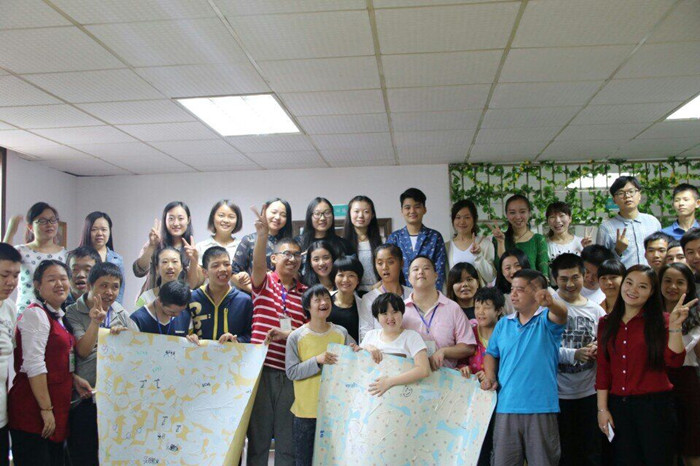 美术交流环节,2013级美术学师范生曾泽翔向慧灵学员张宇成分享了速写的基本方法,并在现场互写肖像。两个大男孩彼此专注观察,以流畅的笔触逐渐构成传神的画面,在速写方法交流中美术技能和朋友情谊共同增长。当他们自豪地在自己的画作上签名并赠送给对方时,大家情不自禁地鼓起掌来。令全场投入的还有近50人集体合作的剪纸贴画,丰富多变的剪纸最终组成2幅富有装饰感的整体贴画,完成后大家集体签名纪念。