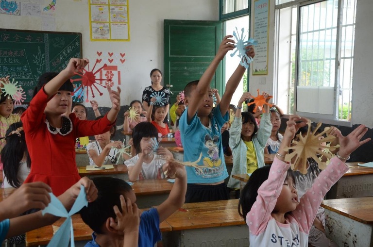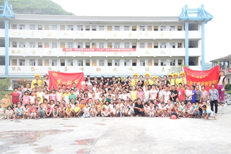 第一天清早,太阳初升,志愿者在校门口准备做宣传工作。群山在大雾笼罩下影影绰绰,远远地竟然看到一些小小的身影结伴而来,忽然一个蓝色的身影闪现,一把抓住志愿者的手,叫着“老师,我来上课啦”,他叫欧阳继源,一个非常活泼的小男孩,他说村里的好多小伙伴们都会来上课。这让志愿者们十分欣喜,悬着的心慢慢踏实下来。没多久,校园里重新充满了欢声笑语。学校有400多个学生,活动第一天出乎意料来了一百多名学生,这让他们受到很大鼓舞。小学没有音体美老师,针对这一实际情况,实践团按当地校长期望重点成立了鼓号队,并开展相应的音乐、朗诵、美术、书法、体育等课程。