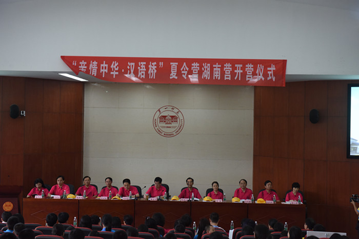 仪式上,校长肖湘愚代表我校全体师生发表了热情洋溢的欢迎致辞。肖湘愚在致辞中首先简要介绍我校的办学历史,并指出本次“亲情中华·汉语桥”夏令营活动是一次寻根之旅、文化之旅,希望参加本次活动的华裔青少年继承祖辈、父辈的优良传统,始终不忘桑梓情,不忘祖宗言,不忘华夏根,在活动期间,多了解中华文明的博大,多感受湖湘文化的魅力,认真学习汉语,把祖国的优秀文化、家乡的风土人情带回去,把家乡人民的亲切问候转达给家人和朋友,努力成为中华文化的海外继承者和传播者,成为湖南人民与海外各国人民友好往来的使者。