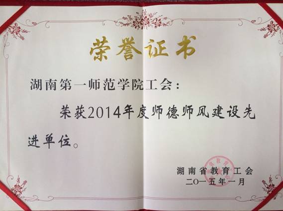 会议对湖南省教育工会2014年的工作进行了总结,研究部署了2015年的任务,并对2014年的先进单位进行了表彰。我校工会被评为“2014年度师德师风建设先进单位”。
