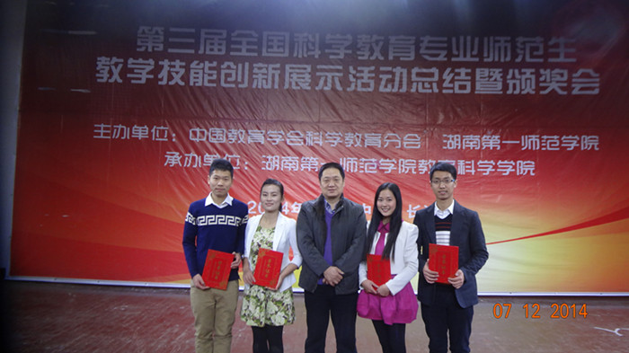 本次展示活动由教学设计、模拟授课、现场提问和即兴演讲四个环节构成,充分考察了学生的科学教育理论与教学技能水平。经过两天的激烈角逐,活动评选出特等奖7名,创新奖4名,一等奖28名,二等奖42名,三等奖19名,优秀组织奖10名。我校派出4名选手参赛,荣获5项大奖:即特等奖4项、创新奖1项、优秀组织奖1项。另有张平柯、蔡海军、陈莉、郑敏、范增、许兰、莫敏等老师获优秀指导教师奖。再创该活动举办以来单个学校获奖“质”和“量”最好记录。获奖选手2012级605科教班杨淑琴、2013级633科教班姚新丽、634科教班陈泽世、635科教班李志鹏全部来自六年制公费师范生,充分展示了我校六年制小学教育专业的办学水平。