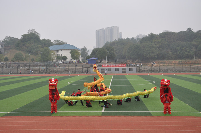 开幕式后,举行了大型的团体操表演。2013级同学表演了《七彩阳光》广播体操、《旭日东升》武术操,2014级同学表演了《毛氏六段锦》、《小苹果》,学校龙狮队表演了《舞龙舞狮》。