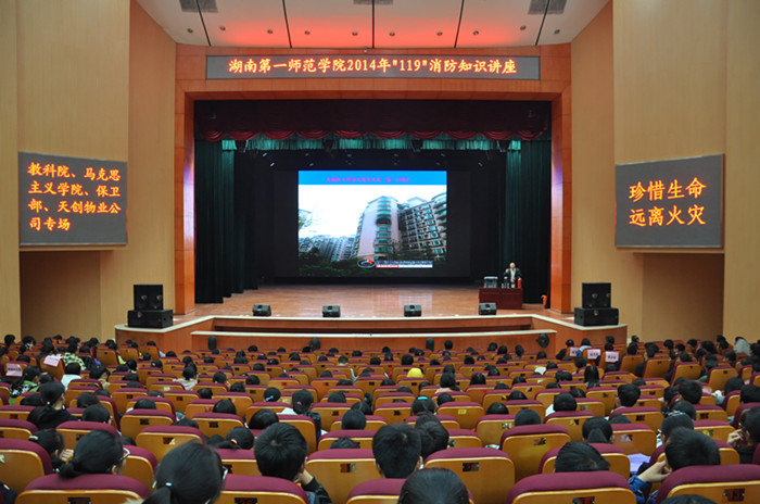 东方红校区音乐剧场和城南书院校区大礼堂里座无虚席,来自长沙市普消宣传指导中心的消防安全知识宣讲员为大家带来了精彩的消防安全专题讲座。他们通过生动翔实的案例讲解,让在座的2014级新生、辅导员、物业人员及保卫人员进一步了解了火灾的危害性、防范的重要性以及在险情中的应对措施。针对学校的特点,教员还重点介绍了学生宿舍火灾隐患、火灾防护、火灾现场如何保全生命、自救逃生的方法,并特别指出火灾逃生最重要的是要保持冷静、掌握技巧。
