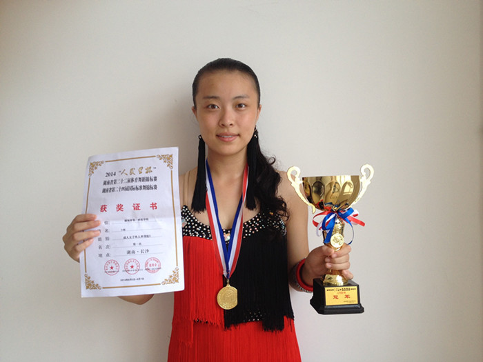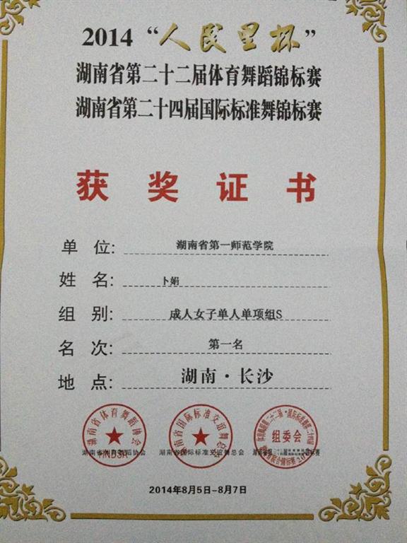 今年暑假,2014年湖南省“人民里杯”第二十二届体育舞蹈、二十四届国际标准舞锦标赛在长沙中南林业科技大学体艺馆举行。我校马克思主义学院卜娟同学在本次比赛中荣获成人女子单人组冠军,为学校争得了荣誉,展现了我校学生的青春风采。