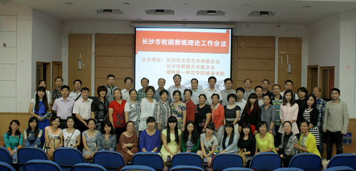 9月13日上午,长沙市剪纸理论工作会议在我校城南书院多功能报告厅召开。长沙市艺术界联合会主席王勇、长沙市民间文艺家协会常务主席戴云、中华文化促进会剪纸艺术专业委员会秦石蛟、长沙市民间文艺家协会秘书长苏振湘、长沙市剪纸艺术委员会会长李民族、城南书院副院长蔡海军等专家与领导及2014年“美丽中国梦”全国校园剪纸邀请赛长沙地区的参赛中小学美术教师近百人参加了会议。会议由李民族先生主持。