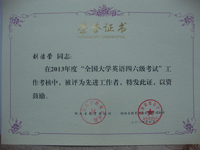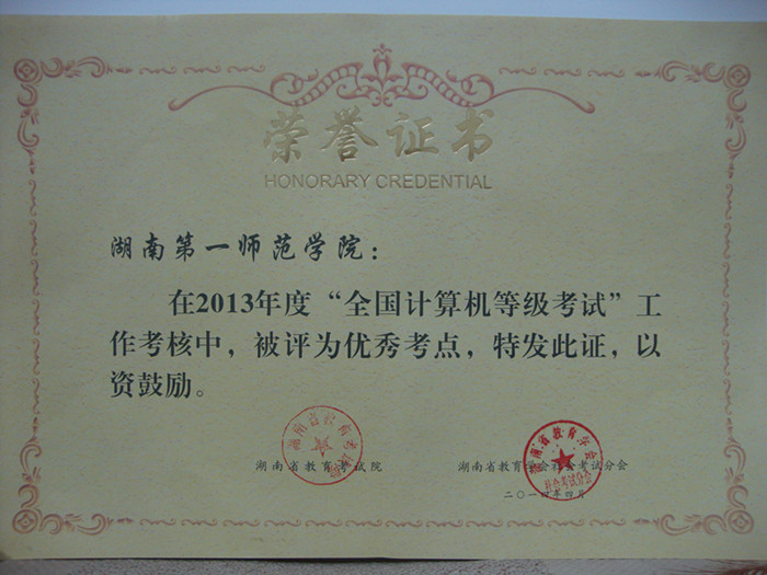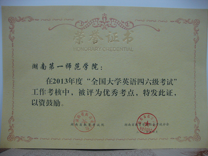 近日,湖南省教育考试院发布了《关于表彰2013年度社会考试优秀考点和先进工作者的通报》(湘教考社字[2014]3号),我校因组考工作严密、成绩突出,被评为“全国大学英语四六级考试”、“全国计算机等级考试”两个项目的优秀考点。据悉,全省只有12所高校同时获得这两项荣誉称号。曹旻同志被评为“全国计算机等级考试”先进工作者,刘洁莹同志被评为“全国大学英语四六级考试”先进工作者。