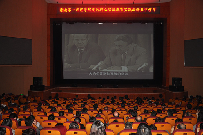 3月18日下午,全体校领导、中层干部、师生党员、学生辅导员1000余人举行了第一次集中学习,一起观看了电影《苏联亡党亡国20年祭——俄罗斯人在诉说》。在观看电影之前,校党委书记彭小奇宣读了我校集中政治学习计划,并对学习的内容和要求做了重点强调。