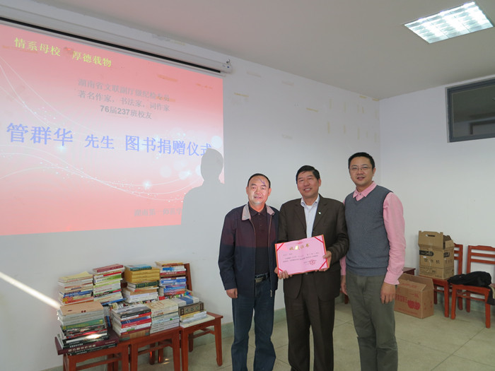 11月8日上午,我校1976届237班校友,湖南省文联副厅级纪检专员,著名作家、书法家管群华先生向我校捐赠图书活动在图书馆会议室举行。校领导刘鸿翔、刘宇及图书馆负责人出席了捐赠仪式。