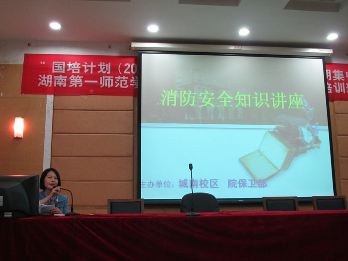 11月8日,保卫处邀请长沙市普安消防宣传中心义务宣讲员李可莹来东方红校区为师生作消防知识讲座。李教官用形象生动的语言向大家讲述了引起火灾的原因和日常的防火知识:如何预防火灾,当发生火灾时如何拨打119电话、如何逃生,火灾的危害,消防服的穿着与作用,灭火器、防烟防毒面具等消防器材的使用等。学生工作处、保卫处工作人员,各系部辅导员,学生安保员,天创物业公司、嘉泰教育投资有限公司员工共400余人认真学习了消防安全知识,并参加了消防演练。清脆的警报声在校园响起,拉开了疏散演练的序幕。在学生宿舍5栋,浓烟逐渐弥漫开来,学生们沉着冷静,用湿毛巾捂住口鼻,迅速而有序地从通道口撤离“火灾”现场。楼道内、楼梯口的疏散人员按照预先的消防演习方案疏散学生,避免拥挤、踩踏现象发生。随后,长沙市高新区消防大队雷锋中队将消防车开到了体育场边的模拟火灾现场,进行实战灭火,让师生与消防员战士来了一次零距离接触。