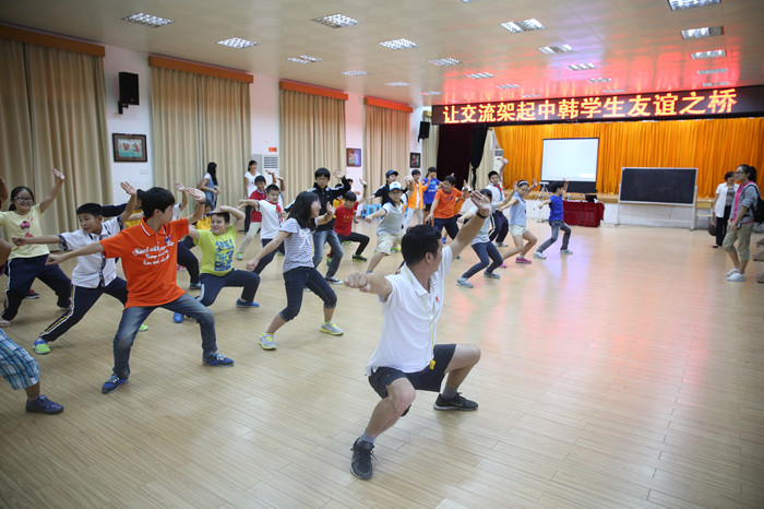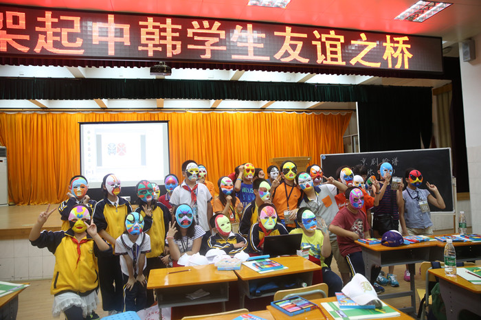 9月12日,韩国学生与我校学生一起,跟随廖芳俭老师学唱中国歌曲《茉莉花》;吴文雄老师教他们中国功夫“五步拳”;李丽斯老师带领他们制作京剧脸谱;林玲老师向他们介绍中国古代的计算器——算盘,并学习珠心算。韩国的孩子对这些具有中国特色的内容非常感兴趣,学得有模有样。