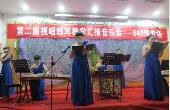 5月24日晚,640音乐班举办了第二届视唱练耳教学汇报音乐会,多样化的表演形式让观众耳目一新,其表演的《卡农》、《彩云追月》、《梅花三弄》等经典名曲将传统与创新完美融合,充满了时代的气息。由郭鑫老师创编的《“锅碗瓢盆”交响曲》,用生活中随处可见的餐具作为演奏乐器,以轻快、活泼而富有活力的节奏将全场气氛推向高潮,充分体现了艺术源于生活、高于生活的法则。音乐会最后在郭鑫老师指挥的《军队进行曲》雄壮的乐声中落下帷幕。