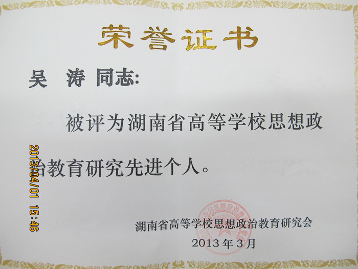 3月29日,湖南省高等学校思想政治教育研究会2013年年会在湘南学院举行。会上,我校学生工作部被授予“2012年湖南省高等学校思想政治教育研究先进单位”(全省18个),学生工作部吴涛被评为“2012年湖南省高等学校思想政治教育研究先进个人”(全省62名)。特向全校师生报喜。