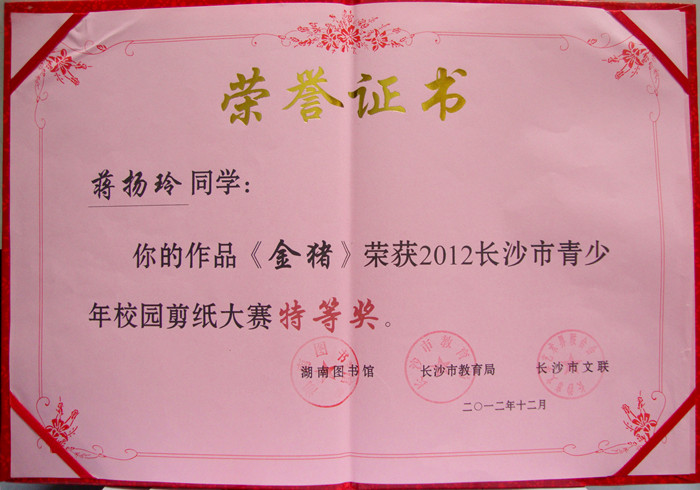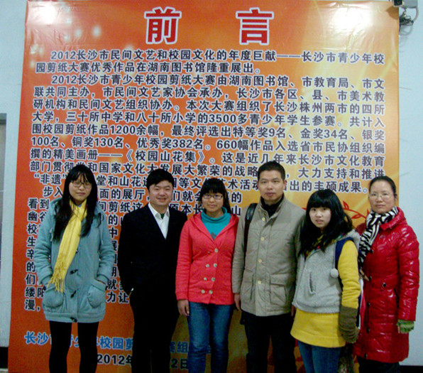 2012年12月23日,由湖南图书馆、市教育局、市文联共同主办,市民间文艺家协会承办,市各区县、市美术教研机构和民间文艺组织协办的2012年长沙市青少年校园剪纸大赛优秀作品展开幕式暨颁奖典礼,在省图书馆隆重举行。我院教育科学系党总支副书记蔡海军与张容舟老师、王勇全老师、黄灿老师、获奖学生代表参加作品展开幕式,并在颁奖典礼上领奖。
