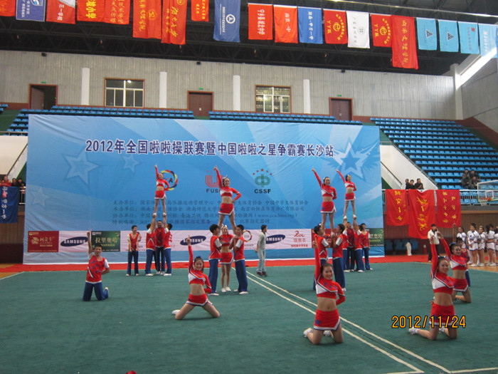 11月23-25日,2012年全国啦啦操联赛暨中国啦啦之星争霸赛长沙站比赛在湖南师范大学体育学院举行。我院啦啦操队在总教练王京琼教授及教练员罗婕、刘国纯、肖琴、单舜老师带领下,参加了13个项目的比赛,喜获9金1银1铜,并获得了参加“全国啦啦操冠军赛暨年度总决赛”的资格。