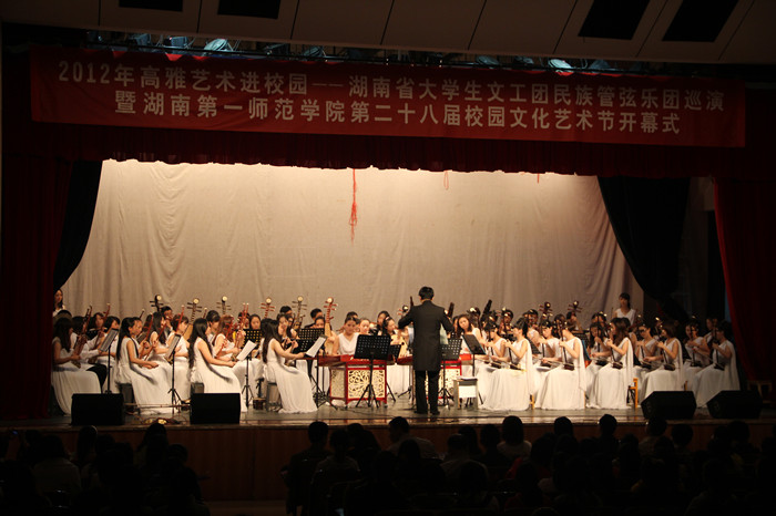 10月25日晚,由湖南省教育厅主办的2012年高雅艺术进校园活动暨我院第28届校园文化艺术节开幕式在东方红校区科技楼演播厅隆重举行。来自湖南省大学生艺术团的师生们用精彩的表演为我院师生奉上了一场音乐盛宴。院团委书记任晓晴、副书记赵小群及师生代表600余人共同观看了这场精彩的音乐会。