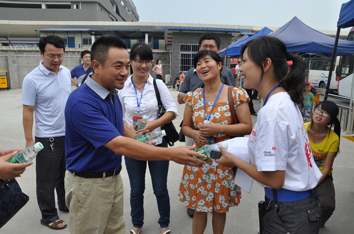 9月7日,院党委书记詹小平顶着炎炎烈日亲自前往汽车西站、火车站等迎新站点向全体迎新师生表示亲切慰问。每到一处,詹书记亲自为迎新师生送上矿泉水,一一握手表示亲切慰问,并再三叮嘱迎新师生,一定要提醒新生与家长注意人身安全、财物安全。在城南书院校区报到现场,詹小平书记还亲切接见了我院2012级湘潭籍新生谢文倩同学。詹书记详细询问了谢文倩当初报考学校的有关情况以及来校的感受,并勉励谢文倩同学一定要好好学习,培养能力,今后更好地服务于家乡的教育事业。谢文倩同学表示,自己对主席的母校向往已久,能来主席曾经学习和工作的地方学习深造是自己莫大的荣幸,一定珍惜这来之不易的学习机会,好好学习,为今后服务家乡的教育事业打下扎实的基础。