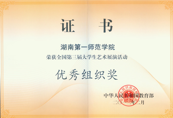 我院团委在相关系部的大力支持下,积极组织艺术节目和艺术类科研论文参加全国第三届大学生艺术展演活动,获得优秀成绩。学院被国家教育部授予全国第三届大学生艺术展演活动“优秀组织奖”,教育科学系谭学念老师撰写的艺术教育科研论文《大众文化时代高校公共艺术教育的思考》荣获三等奖。