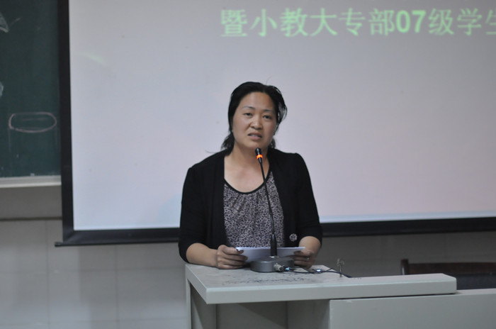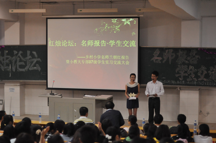 6月2日晚, 我院小教大专部“红烛论坛:名师报告·学生交流会——乡村小学名师兰朝红报告暨小教大专部07级实习生交流会” 在东方红校区实验楼101教室举行了。院党委宣传部部长陈志武,小教大专部主任蒋蓉、副主任张平柯、副书记蔡海军等老师和07级实习生参加了报告会。