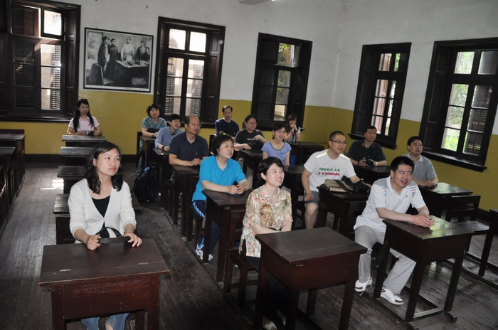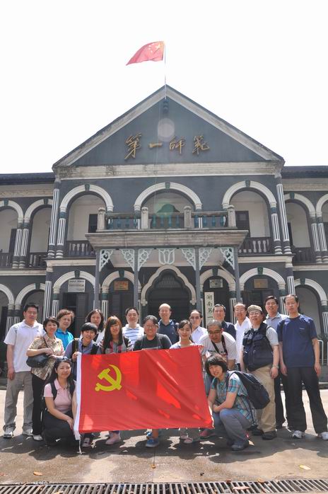 为庆祝建党九十周年,考察团沿着红色景点追寻革命先辈足迹,缅怀老一辈无产阶级革命家的丰功伟绩。他们怀着崇敬的心情参观了青年毛泽东纪念馆,并在学校大门口郑重地展开党旗,合影留念。