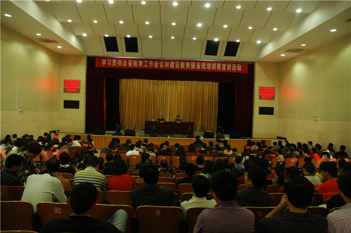 4月19日下午,我院在东方红校区科技楼演播厅举行了学习贯彻全省教育工作会议和建设教育强省规划纲要宣讲报告会。省教育厅副巡视员陈飞跃作专题报告,院长彭小奇主持报告会。