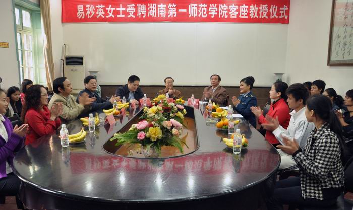 著名青年歌唱家易秒英受聘为我院客座音乐教授仪式于11月7日上午在城南校区办公楼会议室举行。仪式由肖湘愚副书记主持,刘志敏副院长介绍了易秒英的艺术简历,彭小奇院长颁发了客座教授聘书。易秒英接过聘书难掩激动和兴奋之情,她说,能受聘于毛主席曾经学习、工作过八年之久的一师,感到十分荣幸,自己一定要将多年的舞台经验与理论相结合传授给学生,希望跟同学们共同学习、共同进步。