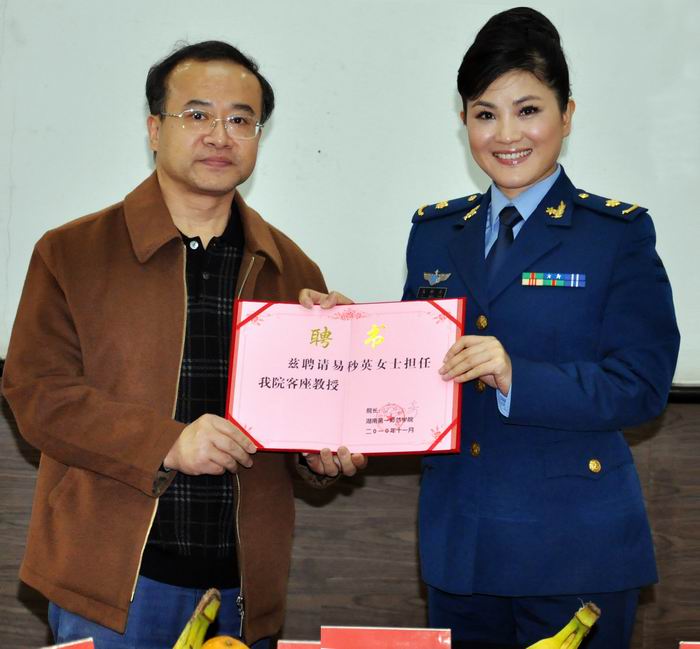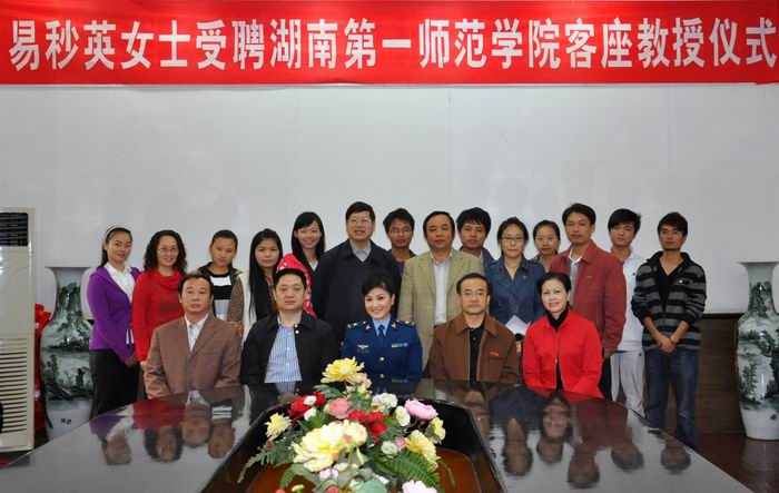 音乐系主任李晓君代表音乐系师生热烈欢迎易老师的加盟,并为其佩戴第一师范校徽。人事处处长杨高全,音乐系副主任谭顺来、副书记谭玉兰,宣传部副部长舒克斌及音乐系师生代表参加了受聘仪式。