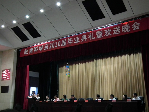 2010年6月22日七时整,教育科学系2010届毕业生典礼暨欢送晚会在科技楼演播厅开幕。院党委副书记肖湘愚、院学生处处长何文、教务处处长陈梦稀、招生就业处处长杨家福、保卫处处长林光明、院团委书记任晓晴、教科系主任彭小虎、副主任王建平、副书记袁向荣及我系全体老师出席了此次典礼并观看了欢送晚会。