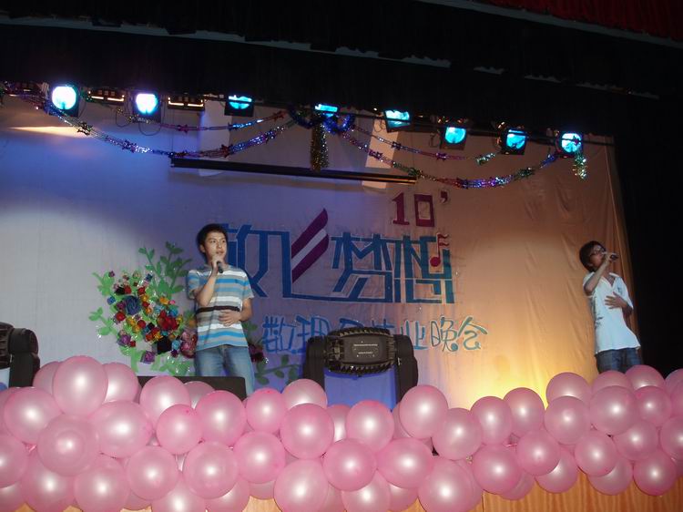 简短而庄重的毕业典礼之后, “放飞梦想”2010届毕业生欢送晚会伴随着歌曲《放飞梦想》正式拉开序幕。舞蹈《天竺少女》、双簧《灵泛堂客》、诗舞《送君·忆》、小品《推销》将晚会不断推向高潮,也充分表达了对即将离去的学长学姐的依依不舍和深深祝福。此外,毕业班的同学也为低年级的同学奉献了三个节目:由安海慧、李志和黄波表演的吉他弹唱,阮晶晶的独唱及阳丽萍的舞蹈。