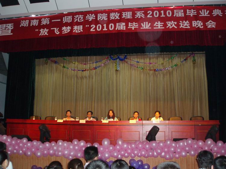 数理系2010届毕业典礼暨“放飞梦想”2010届毕业生欢送晚会于6月20日晚七半点在东方红校区科技楼演播厅精彩上演。数理系主任阎颖教授、学生处副处长丁立平教授、院团委副书记罗祥云老师、数理系副主任胡亚辉教授、数理系团总支书记赵秀青老师在主席台就坐。此外,参与本次典礼的嘉宾老师还有唐懿副教授、谭卫平副教授、唐建生副教授、吕定洋副教授、林敏老师、蒋紫筠老师及辅导员刘燕舞老师、成夏炎老师,学院及兄弟系部的部分学生干部也受邀观看本次典礼及晚会。