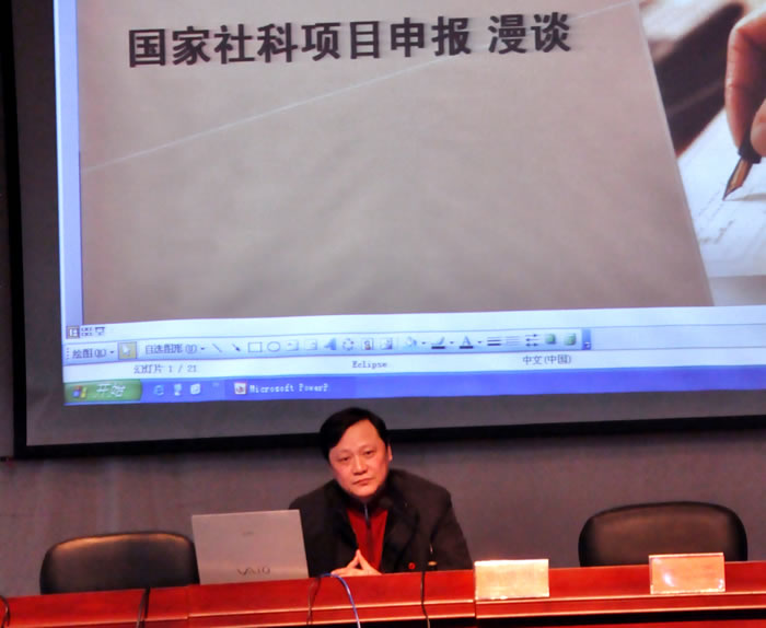 白晋湘教授结合吉首大学申报国家社科基金课题多次中标得出九条经验即:“组织工作要细、把握原则要好、调查研究要深、选题要有冲击力、论证要有说服力、文献一定要新、检索一定要足、思路要清晰、写作水平一定要高”。在谈到课题申报的技术问题时,白教授深刻阐述了课题申报应遵循的 “宜新不宜旧,宜实不宜虚,选小不选大,选易不选难”这四条原则,具有很强的现实指导性。白教授简洁的语言,独到的见解,深刻的意蕴,使在场的老师都受益匪浅。